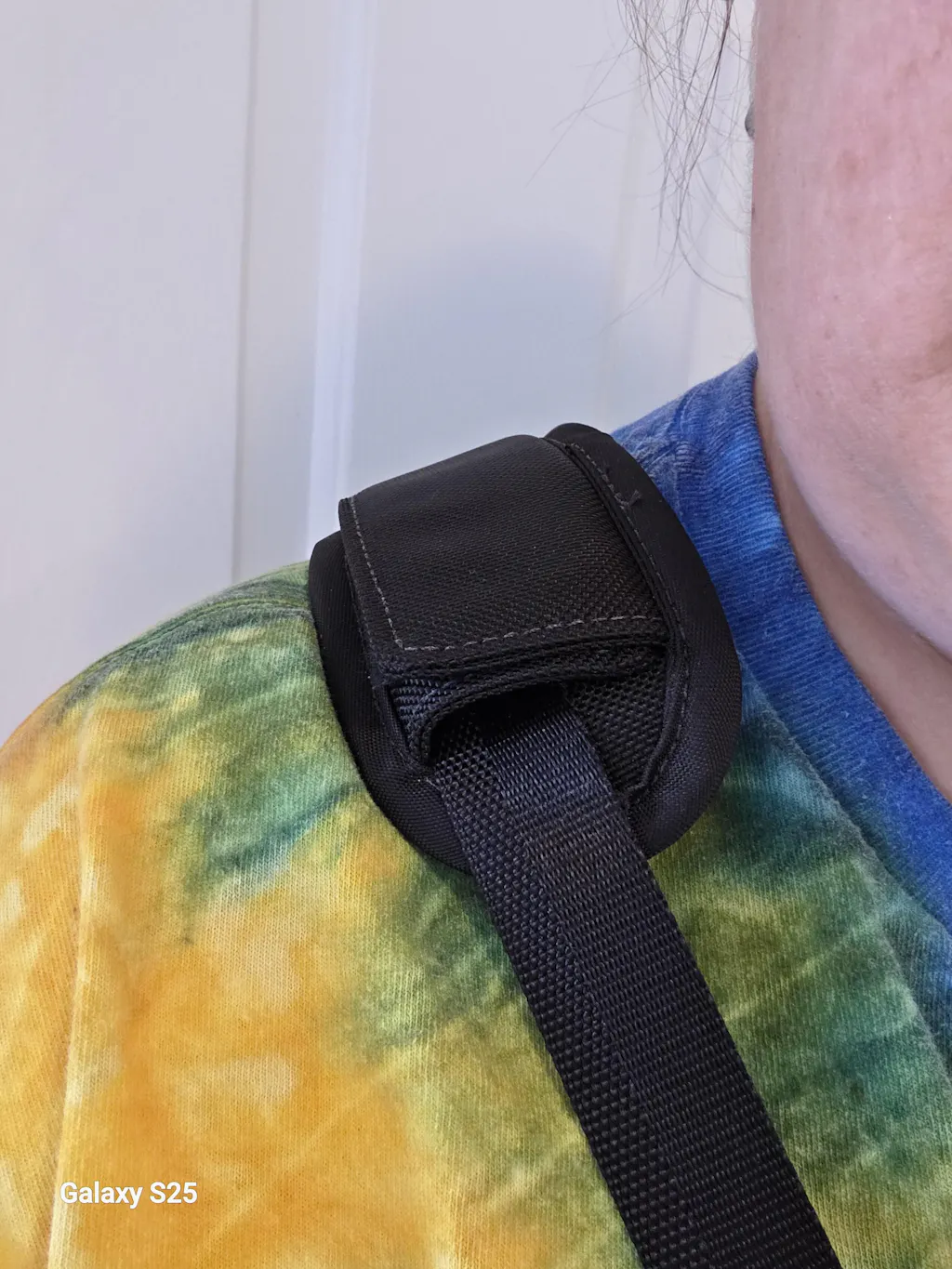 This comfortable ballistic shoulder pad will keep your shoulder happy. Wrap it around your 1.5-inch or 1-inch webbing strap and feel the difference. A grippy underside helps keep your bag planted on your shoulder.