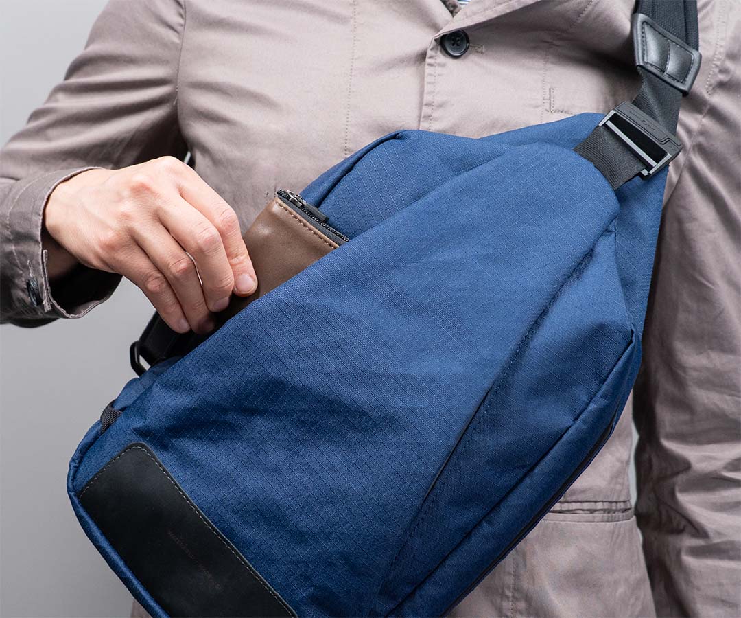 The high-performance ECOPAK™ textile features a diamond pattern that complements the Trigo's profile, resulting in a triangular sling made from fabric with triangular motifs throughout. The slim material enables several layers to be sewn together, making it possible to create the signature triangular pleated front pocket, which expands to accommodate additional content.